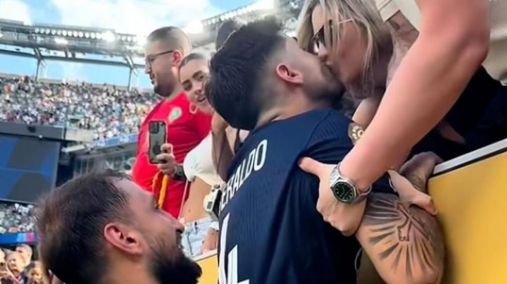 比赛结束后 ,多纳鲁马贴心的把贝拉尔多“举上看台”,让他可以亲吻女友