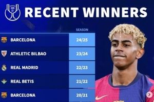 德转列近10年国王杯冠军:巴萨5次登顶,皇马仅在2023年夺冠