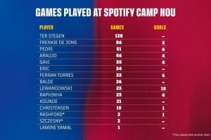 在当前阵容中,五位队长中的四位占据了队内诺坎普球场出场次数榜的前列:特尔施特根、弗兰基·德容、佩德里和阿劳霍。